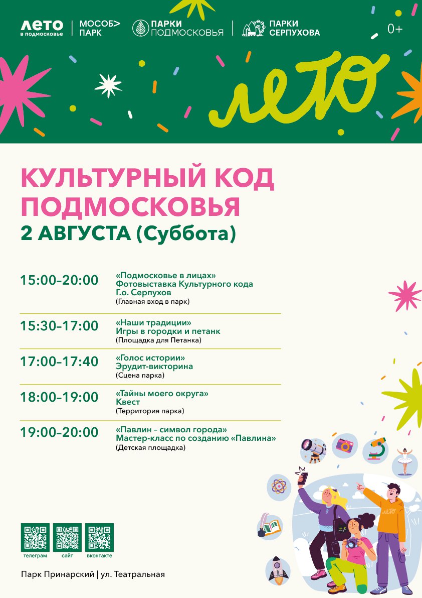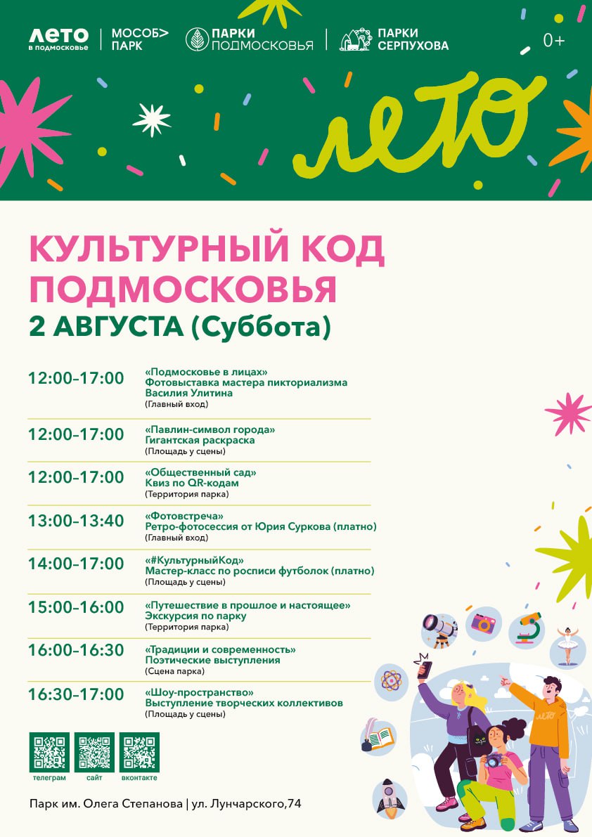 В программе: фотовыставка, огромная раскраска для всех желающих, креативный мастер-класс по преображению футболок в стиле тай-дай, роспись забавных гипсовых фигурок, познавательный мастер-класс по нейрографике, трогательные поэтические чтения от местных авторов, увлекательная экскурсия по парку, яркие выступления творческих коллективов, интерактивные зоны для всей семьи, интеллектуальная эрудит-викторина, захватывающий квест и мастер-класс по созданию символа Серпухова – павлина.